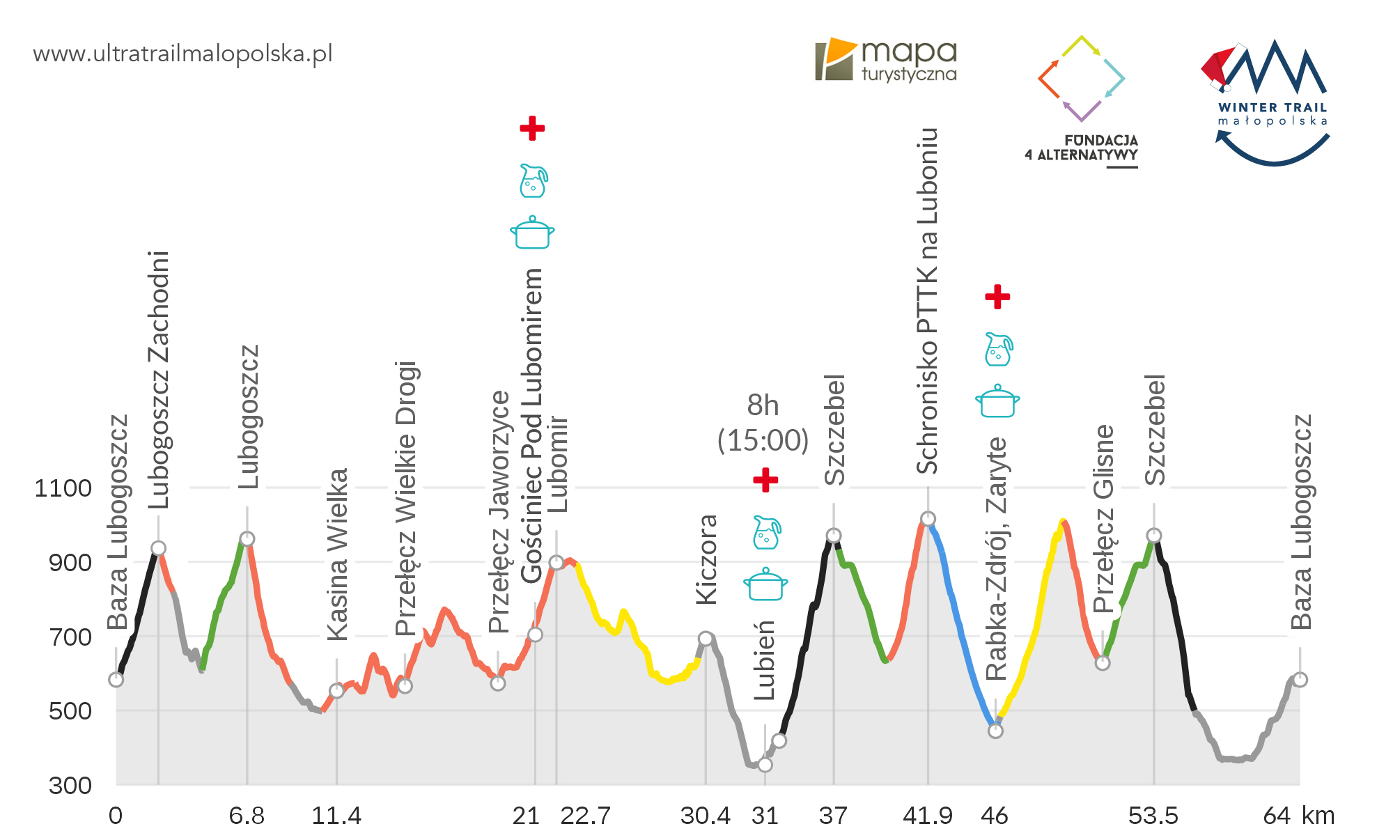 - Rabka Zaryte – control and nutritious / water point, ca. 46 km;