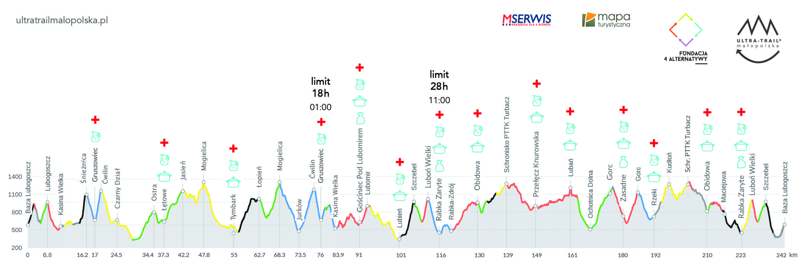 - Obidowa – punkt kontrolny i odżywczy/nawadniania, ok. 133 km;