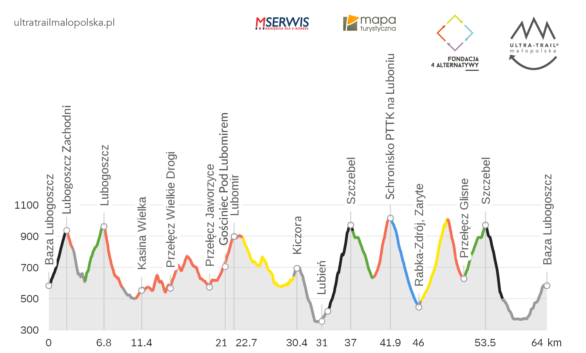 - przewidziano punkt kontrolny i odżywczy/nawadniania: Przełęcz Jaworzyce (pod Lubomirem) około 21 km;