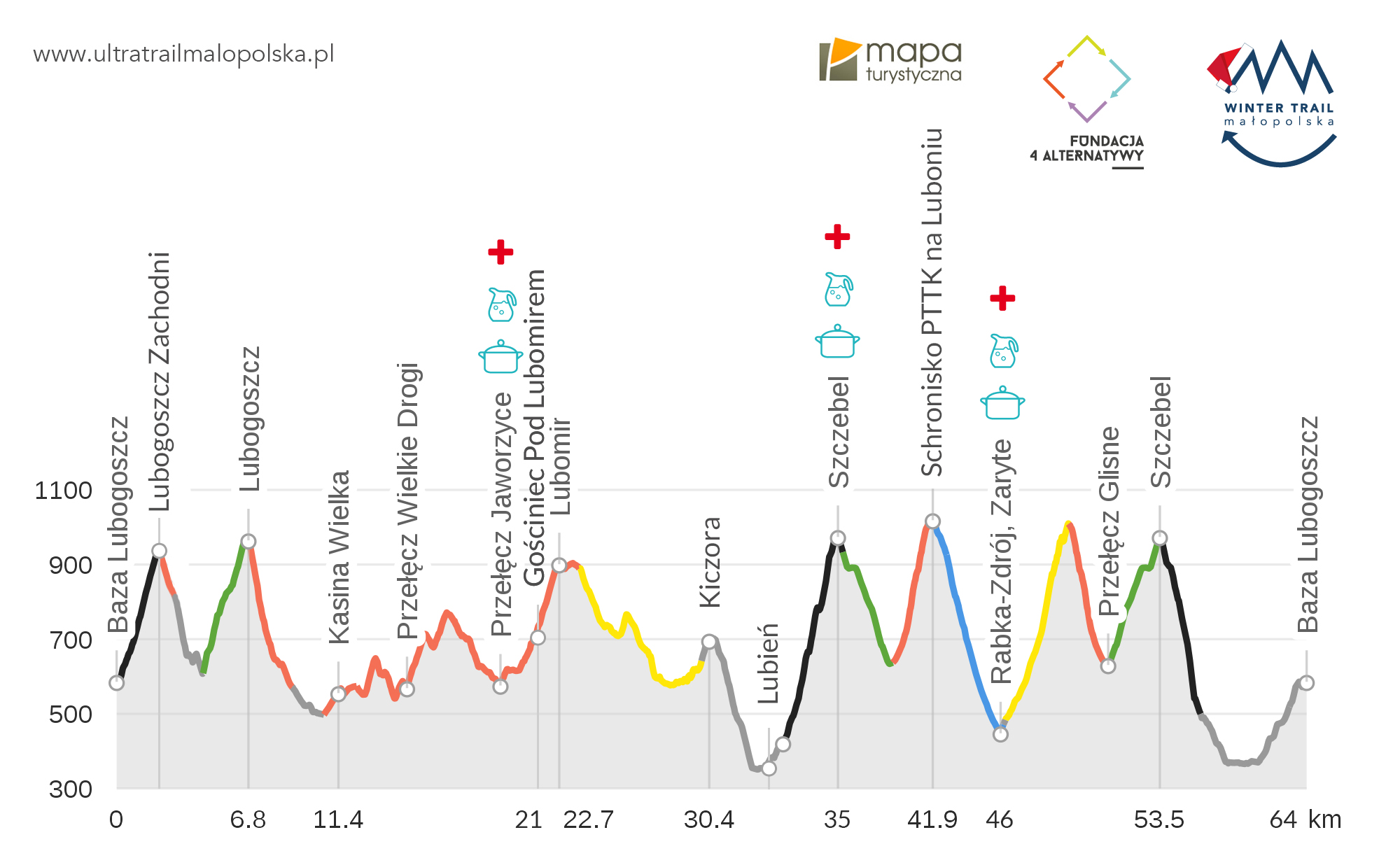 - Rabka Zaryte – punkt kontrolny i odżywczy/nawadniania, ok. 46 km;