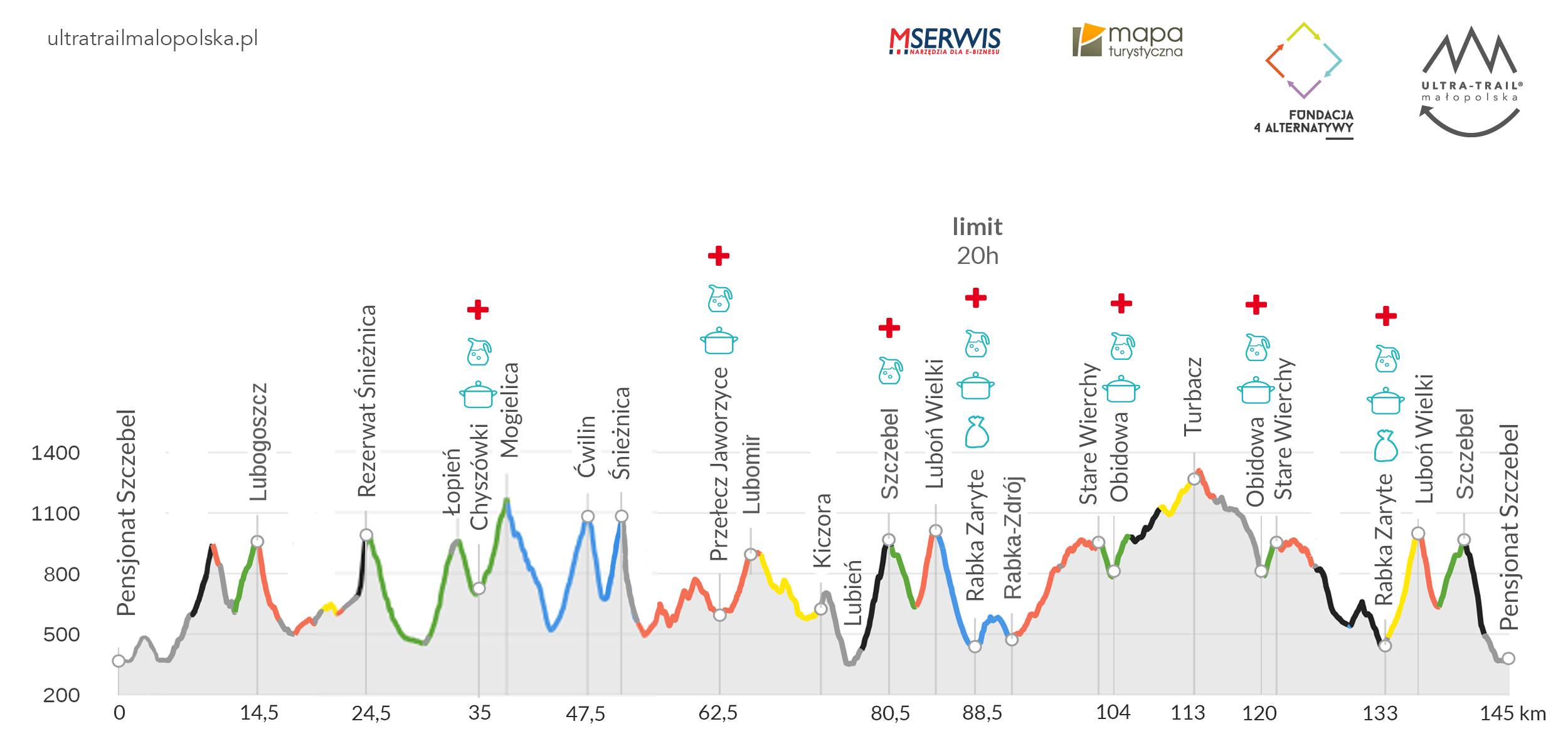 - Obidowa – punkt kontrolny i odżywczy/nawadniania, ok. 120 km;